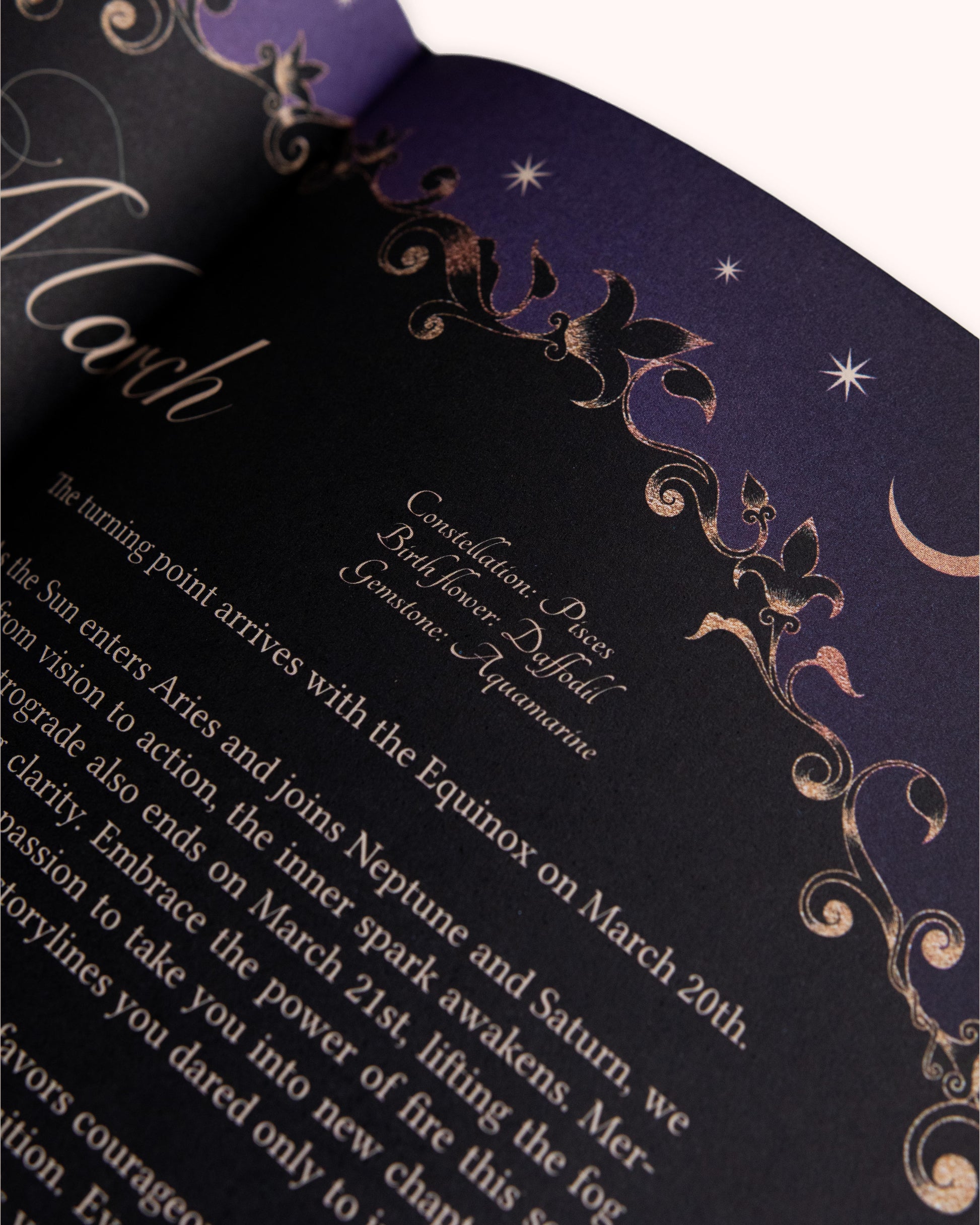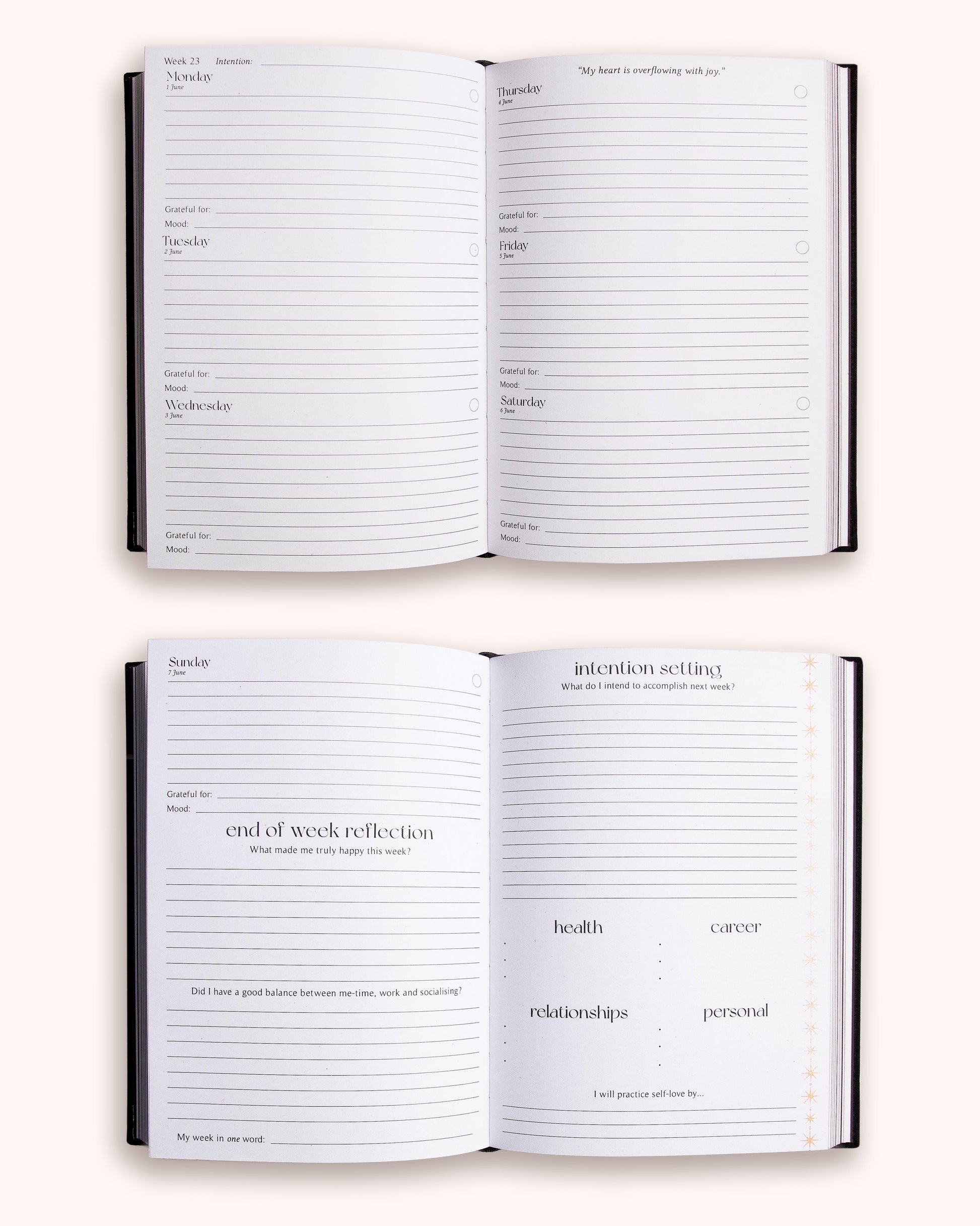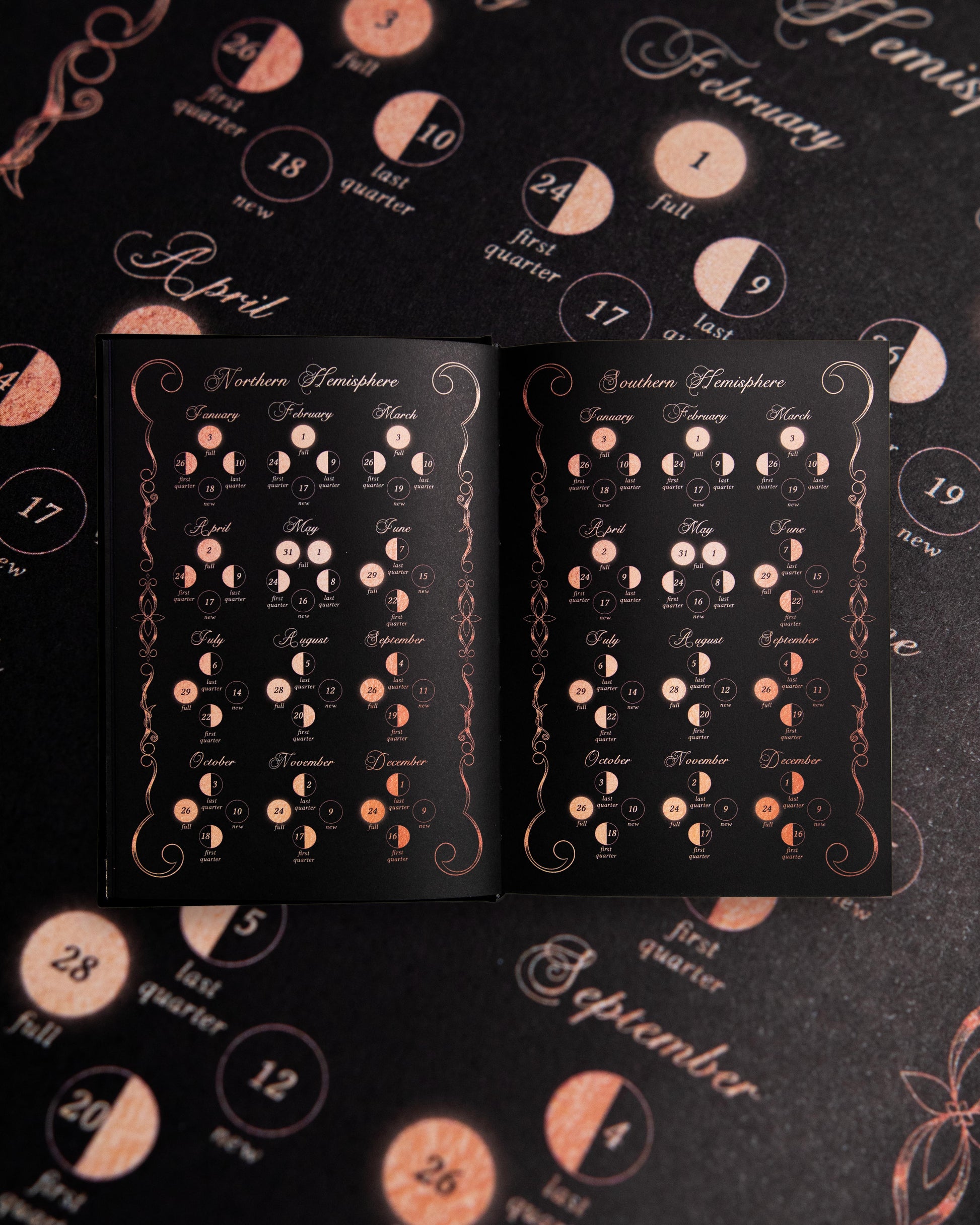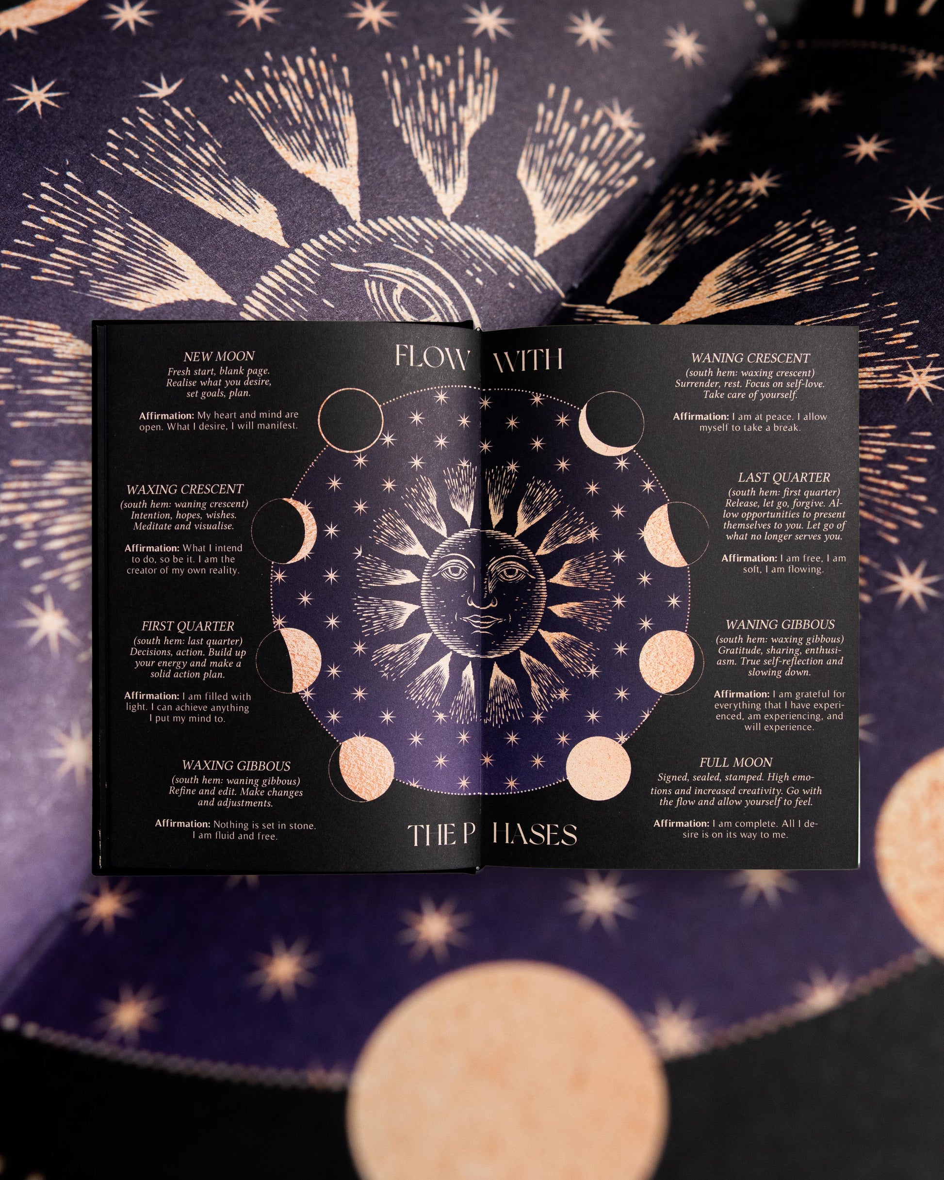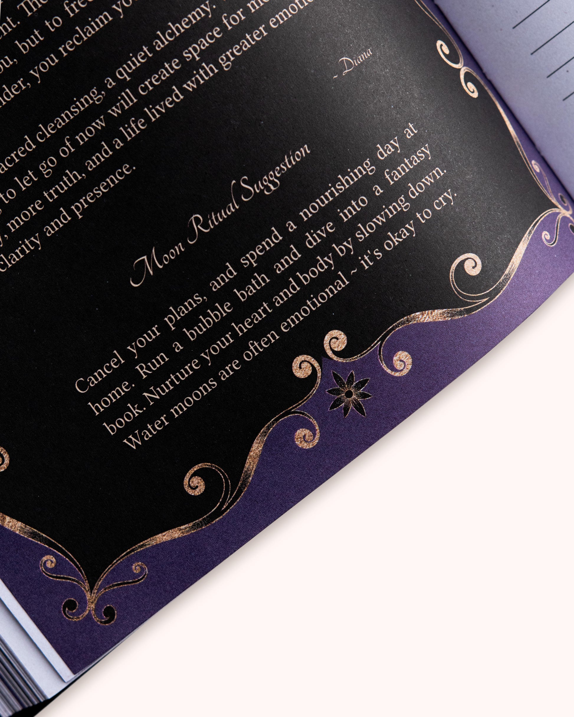 Dagbókin inniheldur rituals fyrir nýtt og fullt tungl, "habit tracker", íhugun fyrir hvern dag, plass til að líta yfir liðna viku og liðin mánuð ásamt ýmsu öðru.